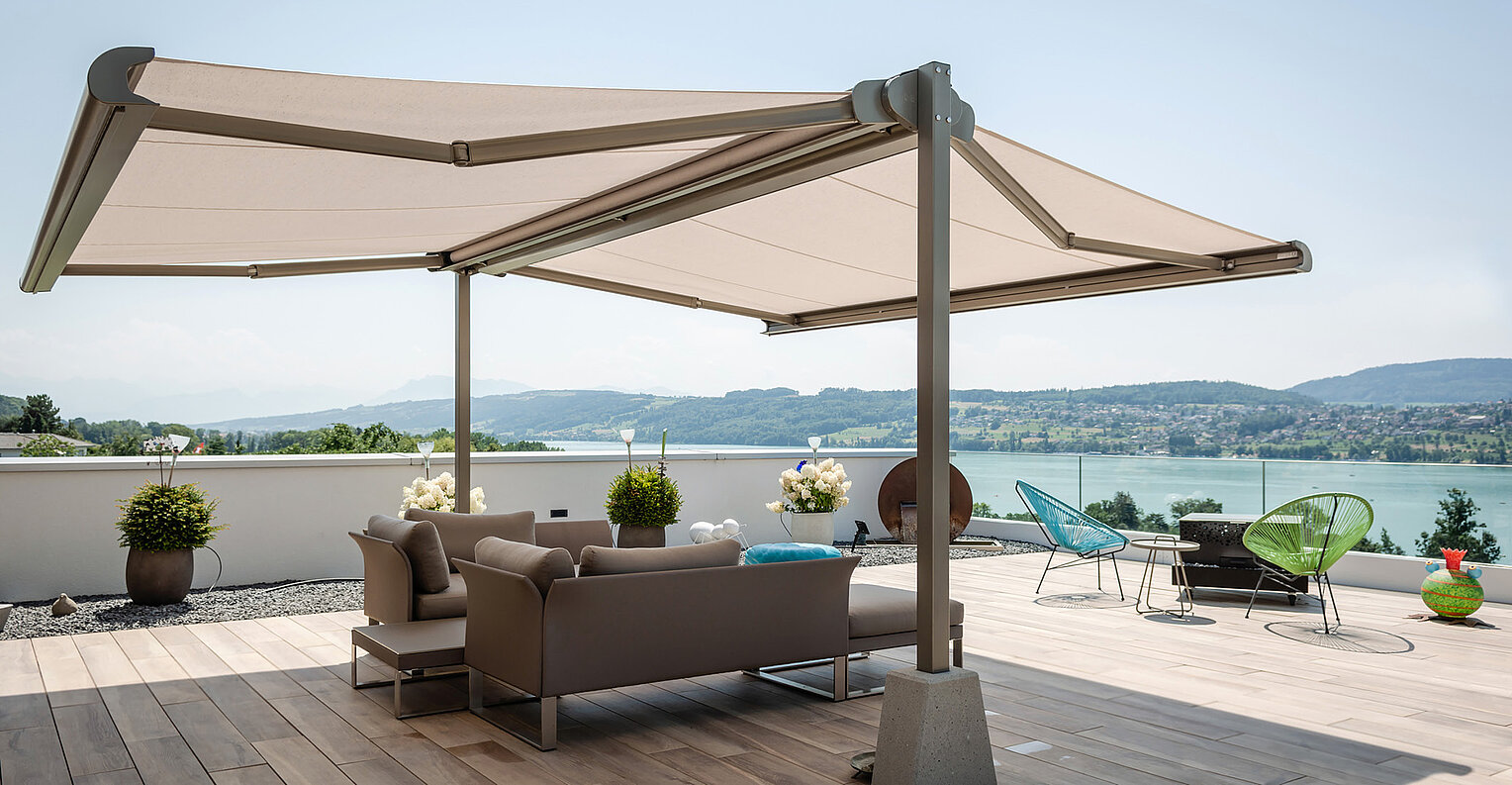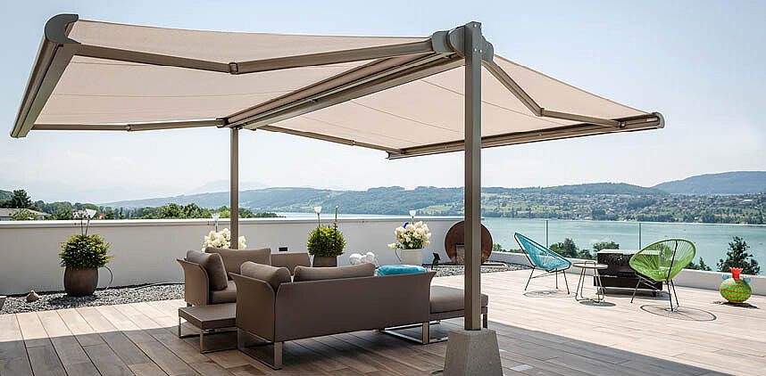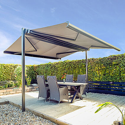 Freistehende, doppelseitige Kassettenmarkise für maximale Flexibilität im Außenbereich. Beschattet große Flächen bis 45 m², ist unabhängig von Fassaden montierbar und bietet komfortablen Sonnenschutz nach Maß.