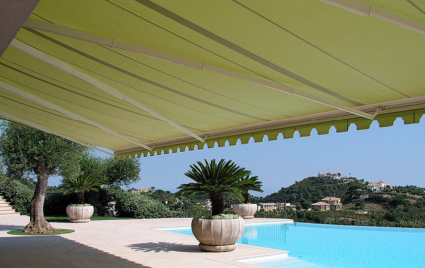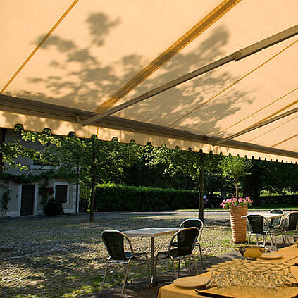 Eine Teleskoparmmarkise für große Beschattungsflächen. Freischwebend und präzise gefertigt, bietet das Modell großzügigen Schatten für Terrasse, Gastronomie und Outdoor-Bereiche.