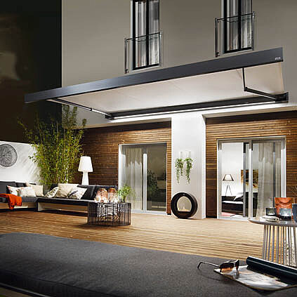 Die integrierbare LED-Beleuchtung im Kasten oder Ausfallprofil schafft Atmosphäre bis in die Abendstunden, wenn die ausgefahrene Markise Wärme speichert und den Außenbereich zum gemütlichen Rückzugsort macht. Auch eine smarte Steuerung per KNX ist – je nach Modell – realisierbar.