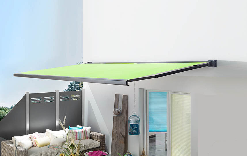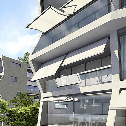 Minimalistische Bauweise und zuverlässige Technik im Kleinstformat. Die kompakte Kassettenmarkise bietet maßgefertigten Sonnenschutz für Balkone und Loggien und schützt Tuch und Gelenkarme.
