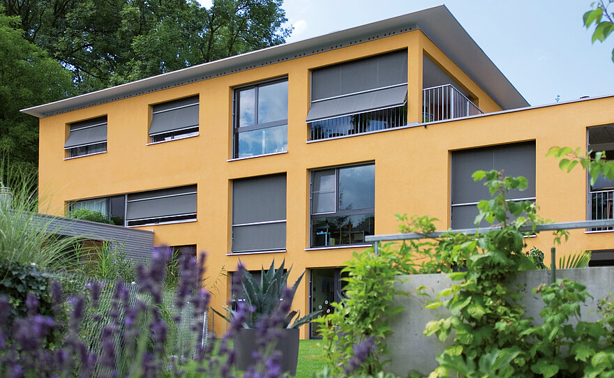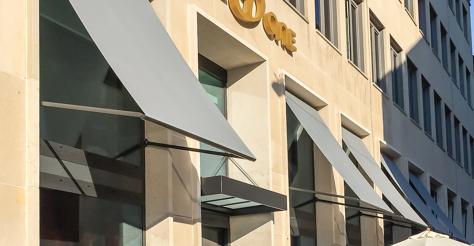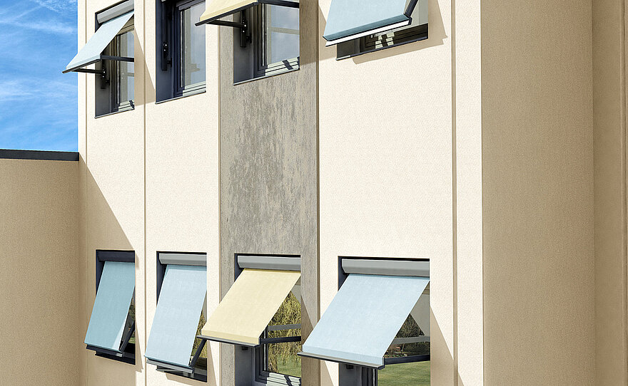 Fallarm- und Austellmarkisen regulieren Tageslicht auf intelligente Weise: Das schräg ausgestellte Tuch schützt vor Sonne und Blendung, lässt aber weiterhin Durchsicht und frische Luft zu. Die formschöne Technik fügt sich optimal in unterschiedliche Architekturkonzepte ein und eignet sich für Häuser, Büros und weitläufige Fensterfronten.