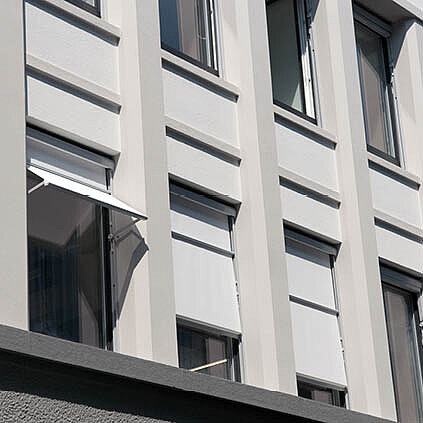 VISOMBRA ist eine Fallarm- und Ausstellmarkise für große Fensterflächen. Der 180°-Schwenkbereich ermöglicht eine präzise Abstimmung von Tageslicht und Schatten und sorgt für optimalen Sicht-, Blend- und Sonnenschutz.
