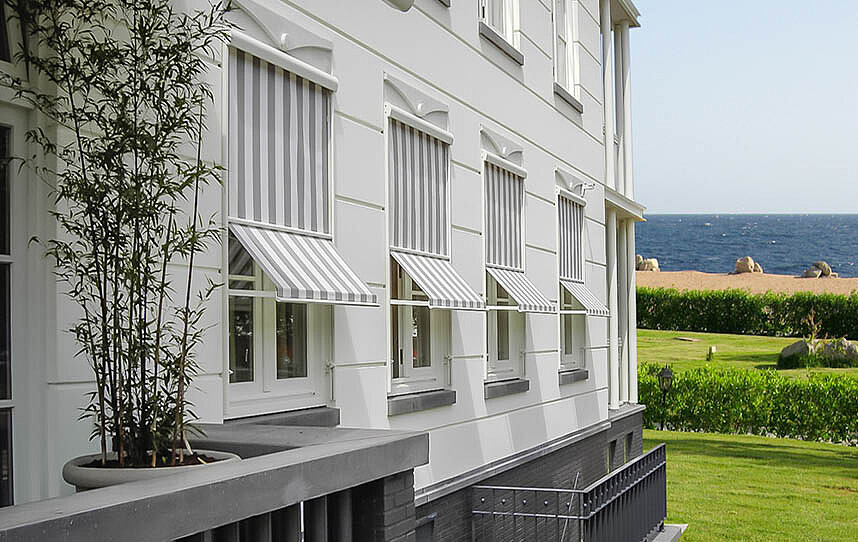 So bleibt der Innenraum angenehm temperiert, ohne vollständig abgedunkelt zu werden. Ein freitragender Kasten schützt Tuch und Mechanik zuverlässig und unterstützt die klare, formschöne Designsprache. Die unter Federspannung stehenden Ausstellarme sorgen für eine hohe Windsicherheit in jeder Position. Der Ausstellpunkt lässt sich stufenlos einstellen und präzise an Nutzung, Fassadensituation und wechselnde Lichtverhältnisse anpassen.