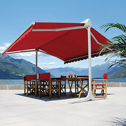 Eine freistehende Doppelmarkise mit Gelenkarmen für Garten, Gastronomie oder Kindergärten. Ohne Mittelstütze entstehen frei nutzbare Schattenflächen. Eine gemeinsame Tuchwelle ermöglicht das synchrone Ein- und Ausfahren beider Seiten.