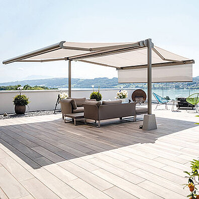 Das OMBRAMOBIL ist als freistehende Doppelmarkise konzipiert und ermöglicht eine Beschattung von bis zu 24 m² – ganz ohne feste Anbindung an Gebäude oder Fassaden. Durch den Verzicht auf eine Mittelstütze bleibt der Raum unter der Markise vollständig nutzbar und bietet maximale Bewegungsfreiheit für Sitzgruppen, Laufwege oder flexible Möblierung.