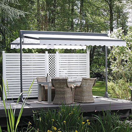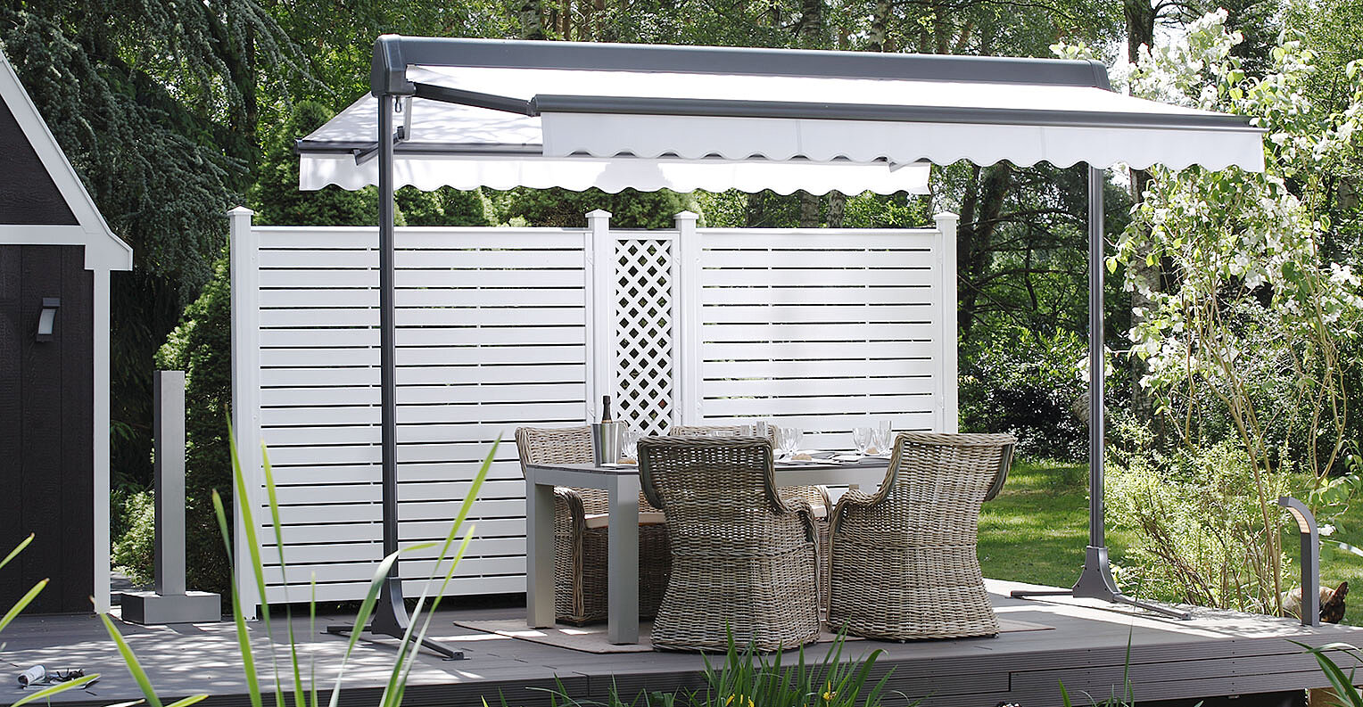 Vier stabile Gelenkarme sorgen für eine gleichmäßige Tuchspannung und ein harmonisches Erscheinungsbild aus jeder Perspektive.