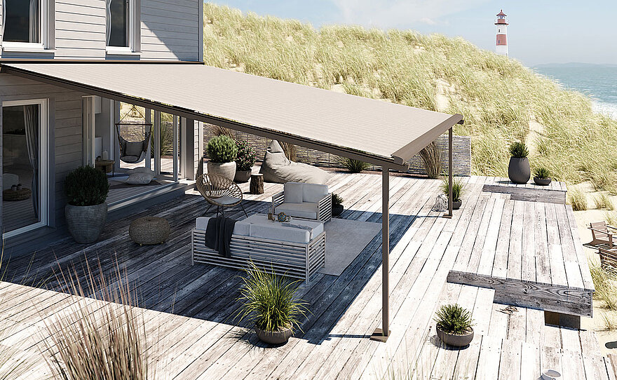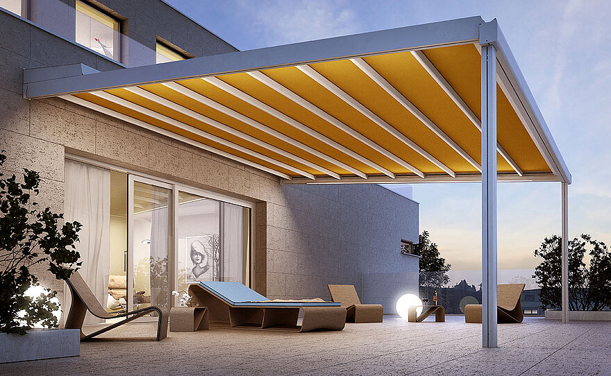 Dank ihrer standfesten Konstruktion mit typischem Pergolacharakter eignen sich Pergolamarkisen von KLAIBER ideal für großflächige Beschattung bis 42 m². Sie schützen zuverlässig vor Sonne und Witterung und sind vielseitig einsetzbar – auf privaten Terrassen ebenso wie in der Gastronomie oder Hotellerie.