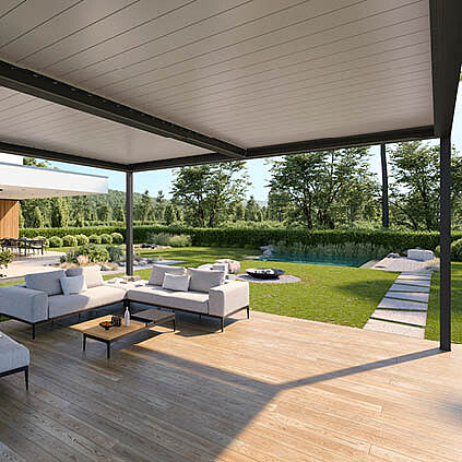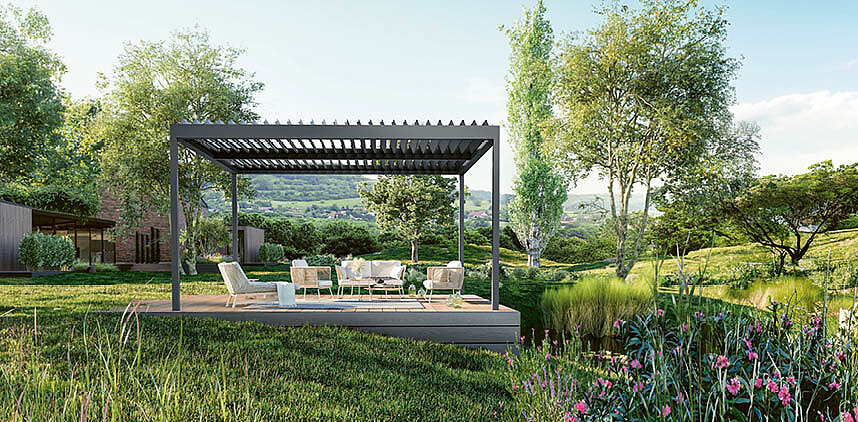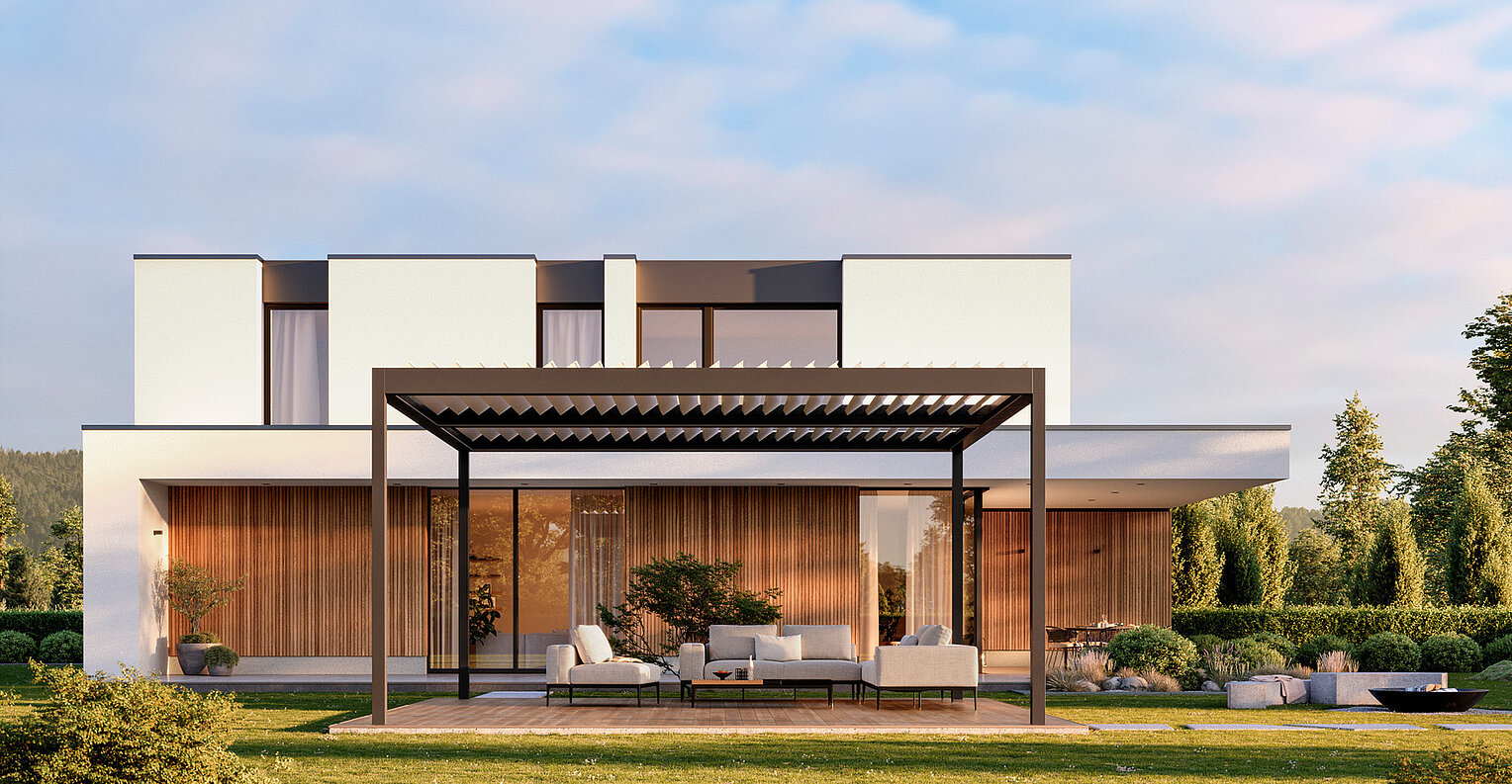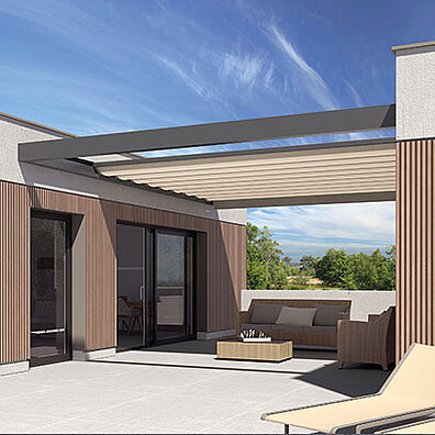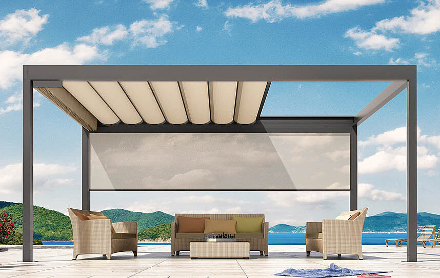 Ein modulares Dachsystem, das offenen Raum neu definiert: wahlweise mit neigbaren Aluminium-Lamellen oder einer robusten Faltmarkise. Ideal für großzügige Terrassen, Gärten und anspruchsvolle Gewerbeflächen.