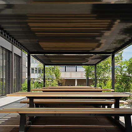 Je nach Projekt lassen sich Front- und Seitenbeschattungen sowie Verglasungen integrieren – für zusätzlichen Schutz und maximalen Nutzungskomfort. Das filigrane Gestell fügt sich harmonisch in moderne Architekturen ein und überzeugt durch hochwertige, witterungsbeständige Materialien.