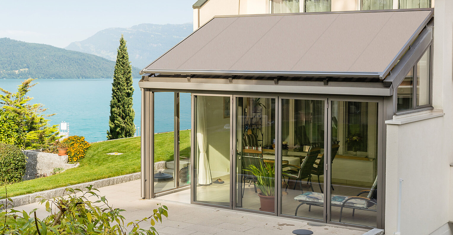 Durchdachte Wintergartenbeschattung für kleine bis mittelgroße Glasflächen. AIROMATIC überzeugt mit kompakter Bauweise, freitragendem Schutzkasten und gleichmäßiger Tuchspannung – als Über- oder Unterglaslösung harmonisch in die Architektur integriert.