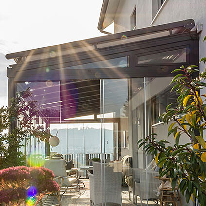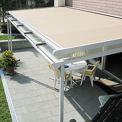 Das Modell AIROMATIC ist wahlweise als Über- oder Unterglasmarkise erhältlich und kann auf Wunsch mit zusätzlicher Geräuschdämpfung ausgestattet werden.
